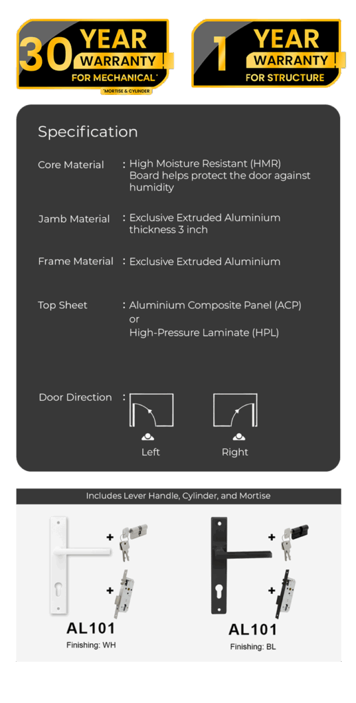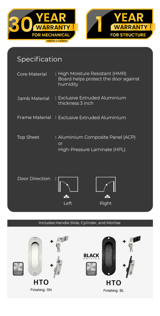 Pintu Aluminium LUMA hadir sebagai jawaban bagi Anda yang menginginkan pintu modern dengan ketahanan maksimal. Dibuat dari material aluminium pilihan, pintu ini tidak mudah berkarat, anti rayap, dan mampu bertahan dalam berbagai kondisi cuaca, sehingga ideal digunakan baik untuk interior maupun eksterior rumah. Desainnya yang ramping namun kokoh membuat pintu aluminium LUMA memberikan kesan elegan dan kontemporer pada setiap ruangan.